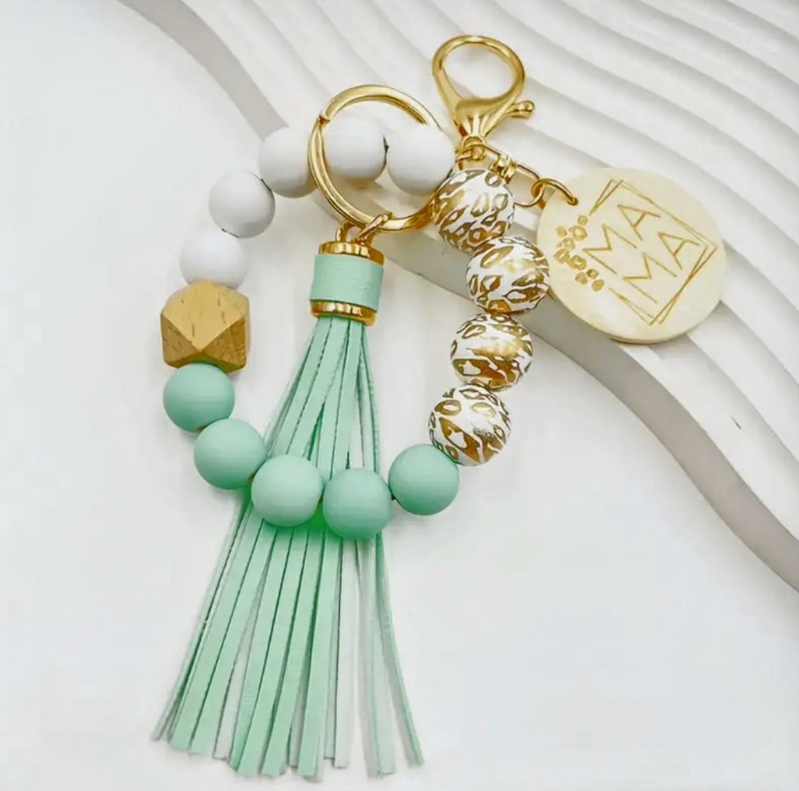 Material: Made from wooden beads, metal keyring, and durable wristlet cord, designed for lightweight, long-lasting use. The ‘Mom’ charm is engraved for a personalized, stylish touch.
